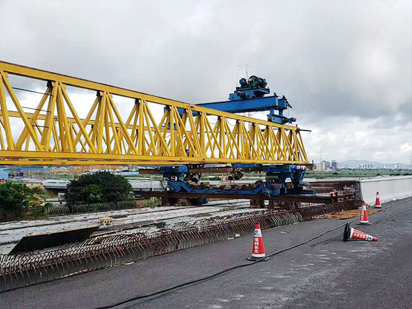 單梁式架橋機,橋梁施工機械之一,其吊臂為一箱形梁,向前懸伸,在其前端有一能折疊的立柱(由左右兩腳桿組成)。該機可在空載狀態(tài)下自行駛?cè)霕蛭?,再將前立柱伸直,支在前方橋墩上。?dāng)所架梁片(或整梁)沿吊臂移動時,吊臂接近簡支梁狀態(tài)。架橋時,該機可在空載狀態(tài)下自行駛?cè)霕蛭?,須先將梁片利用特制龍門吊機從鐵路平板車上轉(zhuǎn)移到特制運梁車上,再將此運梁車和架橋機后端對位,用行駛在架橋機吊臂上的兩臺吊梁小車將梁片吊起,沿吊臂前行,到達(dá)橋位落梁。